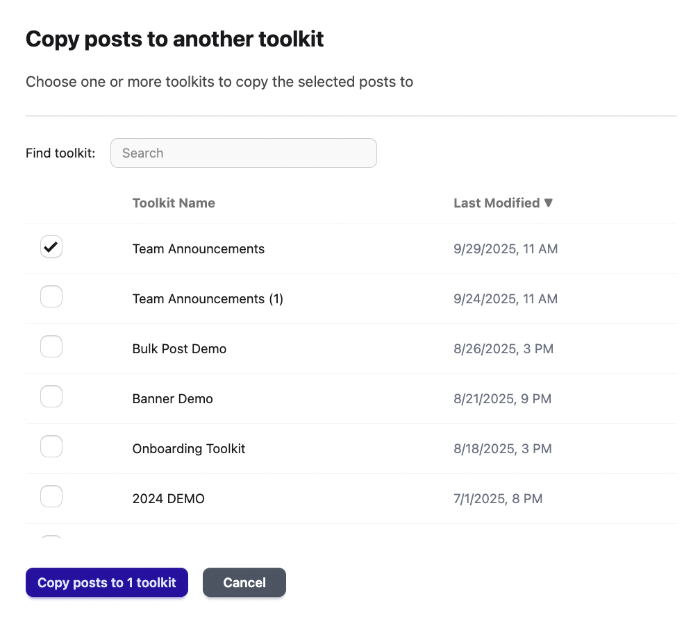 Easily reuse content by copying posts to a different toolkit. This feature is ideal for managing similar campaigns, allowing you to quickly transfer posts without the need for manual copy-and-paste.
