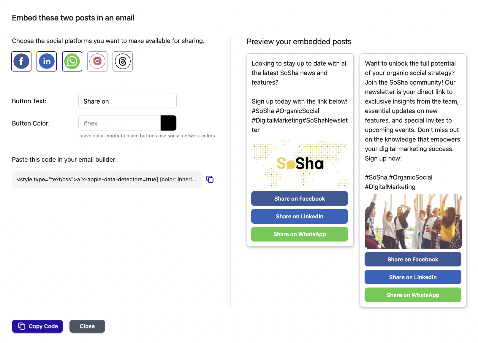 Customize sharing options. Choose the platforms you’d like your posts to be shareable to. You can also customize the button text and color. A live preview on the right will show how your embedded posts will appear in the email.