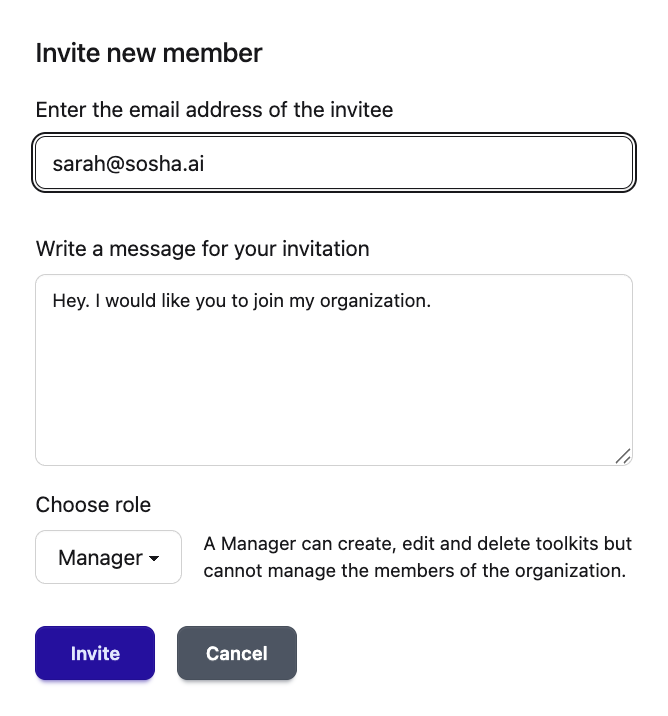 Invite members to be a part of your organization so they can access, manage, and/or edit your organization’s toolkits.