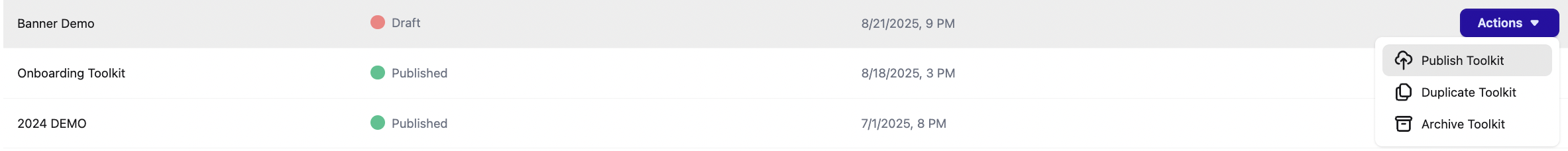 On the toolkit menu, hover over the toolkit you want to publish, click the blue 'Action' button followed the 'Publish Toolkit' button.