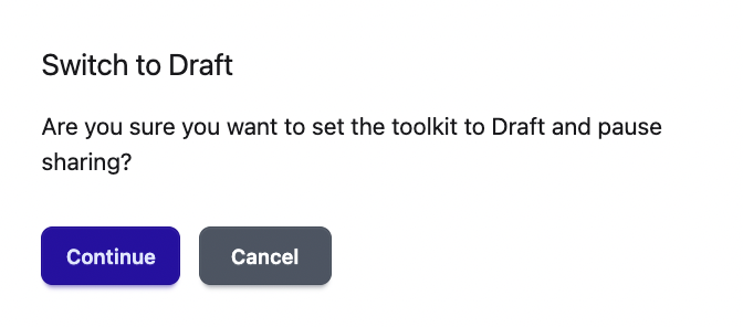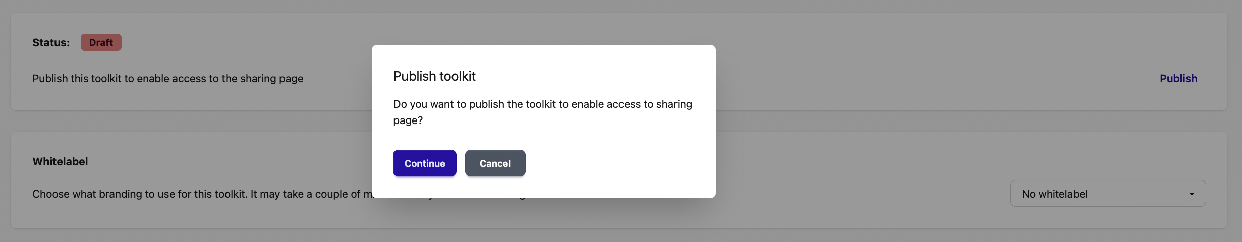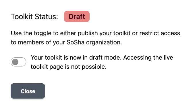 Click the red button and a window will appear where you can use a toggle to publish the toolkit.